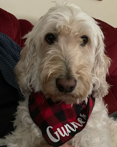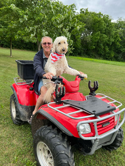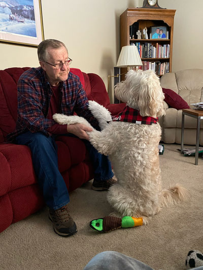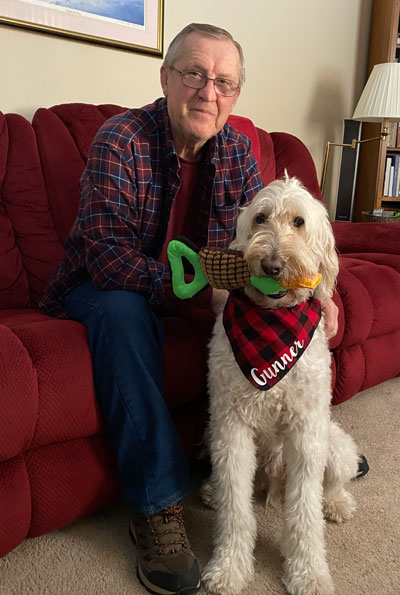 So, one March day, Larry, who was very sad, grieving the death of his beloved wife of 42 years, came with his brother-in-law, Bob, to Nora Zimmerman’s. Bob was intending to buy a puppy, & Larry was intending to help him. Larry’s sons had wanted him to get a puppy, but he wasn’t ready. To help Bob choose a puppy, Larry’s son told him to bring a pot & spoon. When the puppies came to them, they were to bang the pot with the spoon & whichever pup stayed would be the best choice. So, all the adorable golden-doodles came to them. When they banged the pot, all of them ran away except one. Larry petted him & quickly fell in love with the little fella’. So instead of Bob, Larry wound up taking “Delton”, a cute reddish colored pup, home! He renamed him Gunner. From that moment on, they bonded & became best of friends! Gunner’s hair changed to white with the softest hair. Larry trained Gunner who was very smart & easy to train. In later years, he decided to train him to be a therapy dog. Gunner & Larry have comforted many in nursing homes, hospitals, prisons, & various numbers of people. He loves people & they love him. We are very thankful for Gunner & Nora, who bred him!